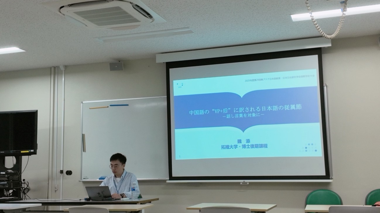 言語教育研究科の博士後期課程に在籍する、魏添さん(2年生)と、張琦さん(2年生)が、「東アジア日本語教育・日本文化研究学会2025年度国際学術大会」にて口頭発表を行いました。この研究会は、2025年8月22日に琉球大学千原キャンパスにて行われました。発表後は今後の研究に役立つ本質的な質問も寄せられ、実りの多い発表になりました。以下、2人のコメントを紹介します。